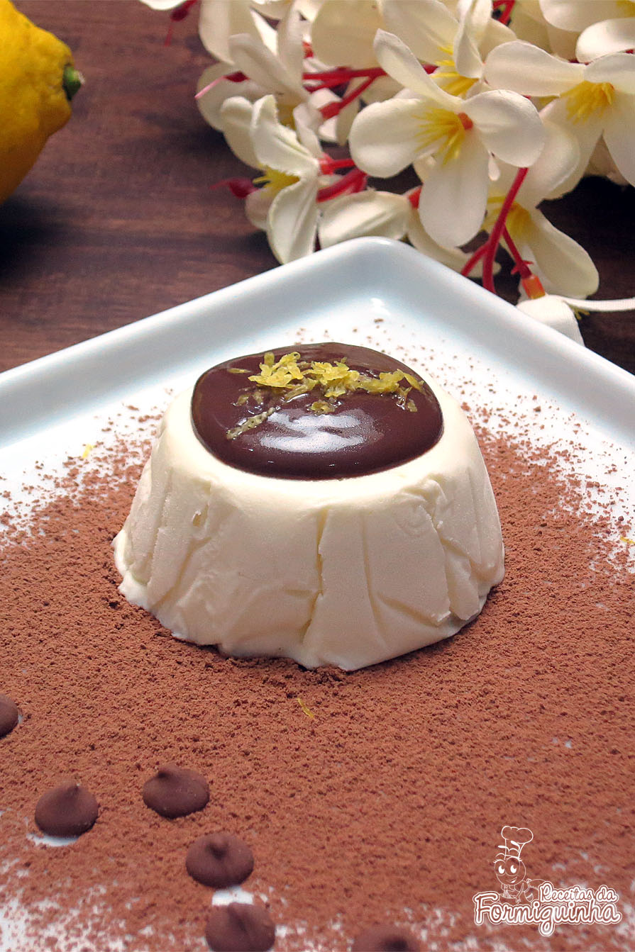 - Coloque no prato em que vai servir e retire o plástico. Decore com frutas, caldas ou geleias e sirva. No meu caso, decorei o prato com chocolate em pó e gotinhas de chocolate. Sobre o semifreddo coloquei a calda de chocolate cuja receita está aqui. Por cima da calda, algumas raspinhas de limão siciliano para enfeitar.