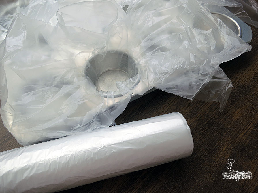 - Molhe levemente por dentro a forma/refratário com água e forre o fundo e as laterais com filme plástico, deixando sobrar nas laterais. A sobra irá servir para cobrir o creme, evitando que crie gelo em sua superfície.