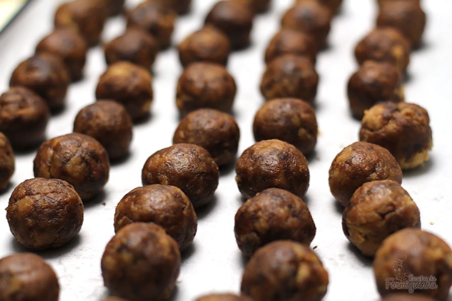 4. Quando estiver pronta, pegue um pouco da massa e faça bolinhas (como se fosse brigadeiro). As minhas tinham aproximadamente 15g cada uma.
