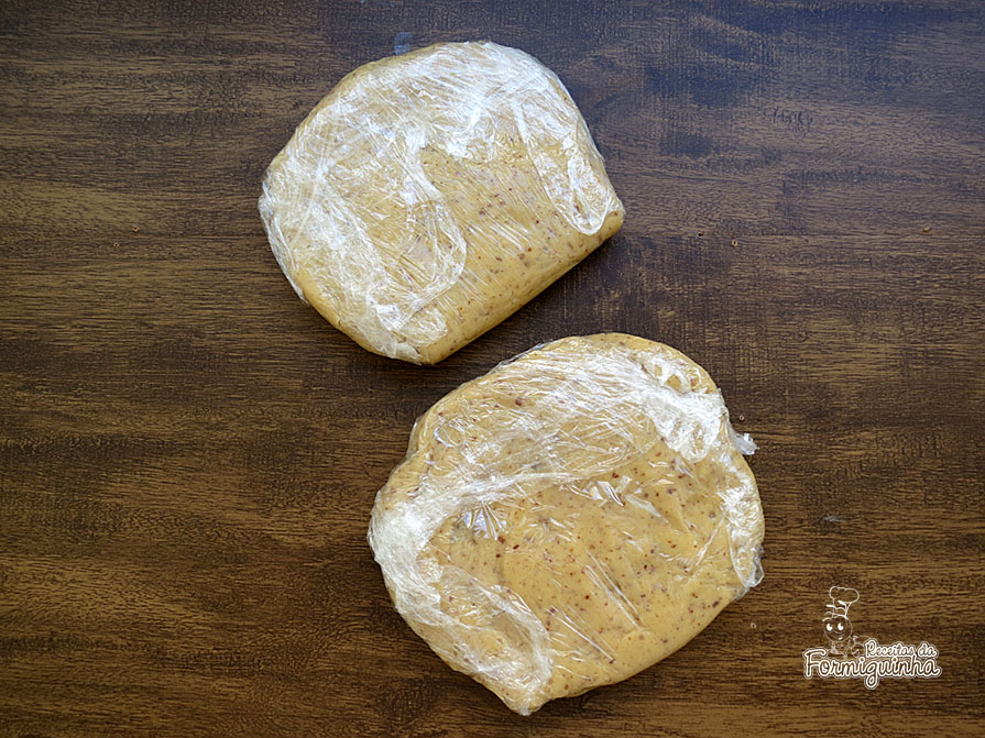 5. Retire a massa da batedeira, divida em duas partes e embrulhe cada uma em filme plástico, achatando bem no formato de um disco. Tente deixar a massa o mais achatado que conseguir.